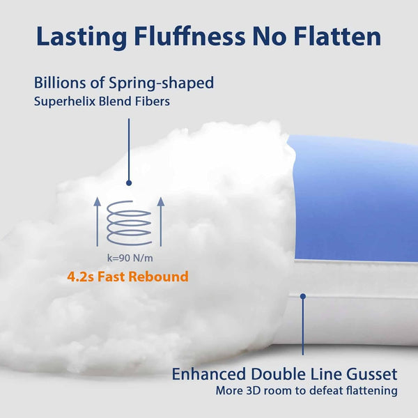 【All Season Plump】 Infused with Golden Ratio of breathable and fluffy Superhelix Blend Fibers, the pillows facilitate superior ventilation and heat dissipation while holding up shape overtime. Besides, the gusset design serves as the backbone of the construction to beat the flatten, creating more room for an evenly distributed fill, provides enough cushioning to promote comfort and better loft without clumping. The Soft side cover fits all weather during years.